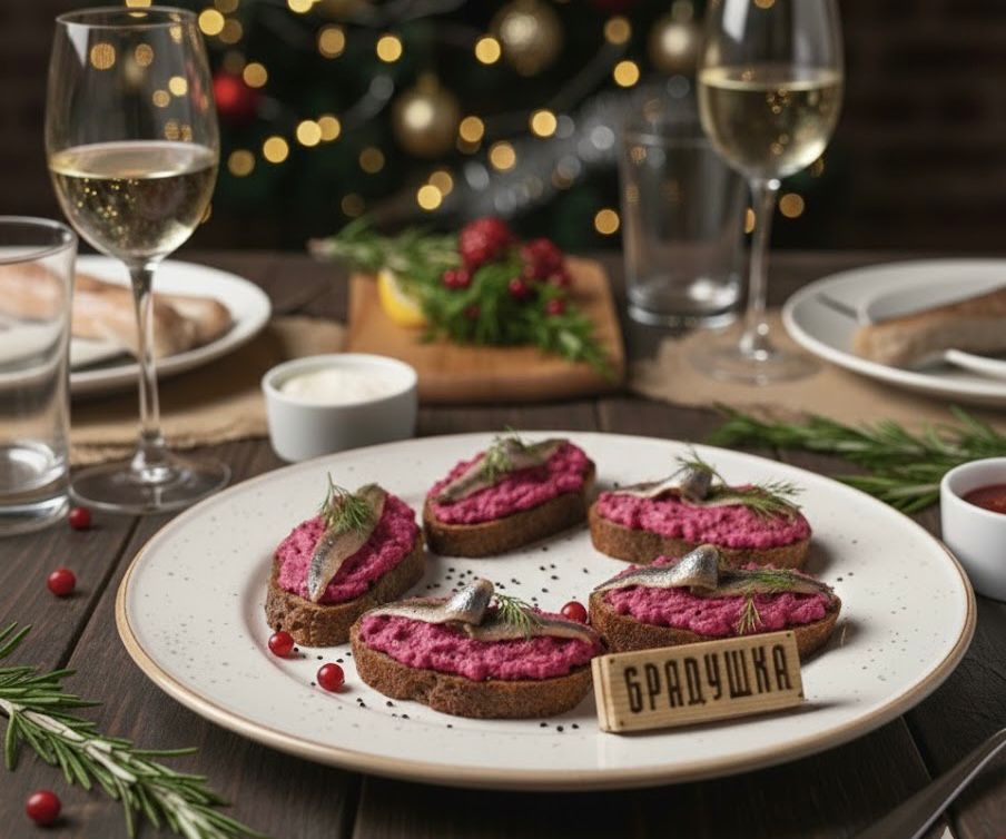 Брускетта на черном хлебе со свекольным муссом и анчоусом (ДОСТАВКА 31 декабря)
