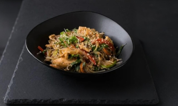 Фунчоза с курицей и овощами  (рисовая лапша, перец болгарский, лук, морковь, кабачок, курица, чеснок, соус Терияки, соевый соус