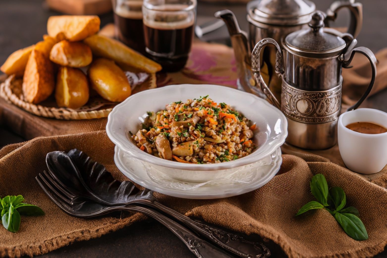 Гречка, шампиньоны, лук, морковь, чеснок, специи