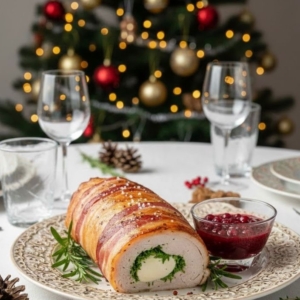 Рулет индейки, запеченный в беконе с начинкой из моцареллы, зеленью и брусничным соусе (ДОСТАВКА 31 декабря)