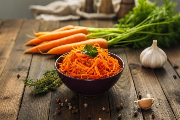 Морковь по-корейски — салат из нарезанной моркови (в виде тонкой и длинной соломки), чеснока, растительного масла и приправ :