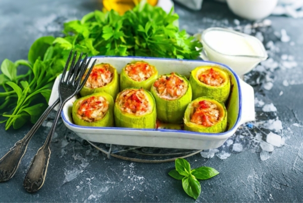 Состав: кабачок, болгарский перец, помидор, курица, лук, твердый сыр, майонез