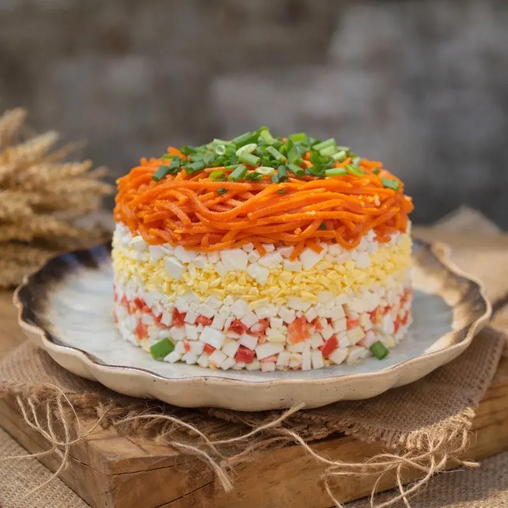 Слоёный салат с морковью по-корейски и крабовыми палочками