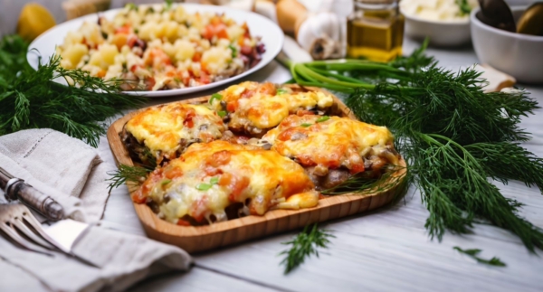 Свинина по-французски (свинина постная, шампиньоны, помидор, сыр твердый)