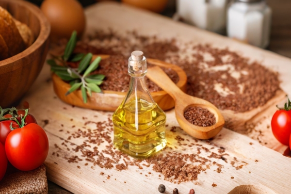 Польза: Отжим в дубовом бочонке без соприкосновения с металлом и без нагрева. Употреблять в свежем виде, жарить нельзя. Сладковатый вкус, без горечи. Содержит омега-3 70% (это больше, чем в рыбьем жире). Содержит фитостеролы, витамины К, Е и холин, а также фосфор, кальций и цинк. Это масло — ценный источник лигнанов. Улучшает пищеварение, очень полезно для женщин в период менопаузы, пьют курсом при похудении. Льняное масло налаживает метаболизм, а также правильное обновление клеток организма. Способствует похудению.